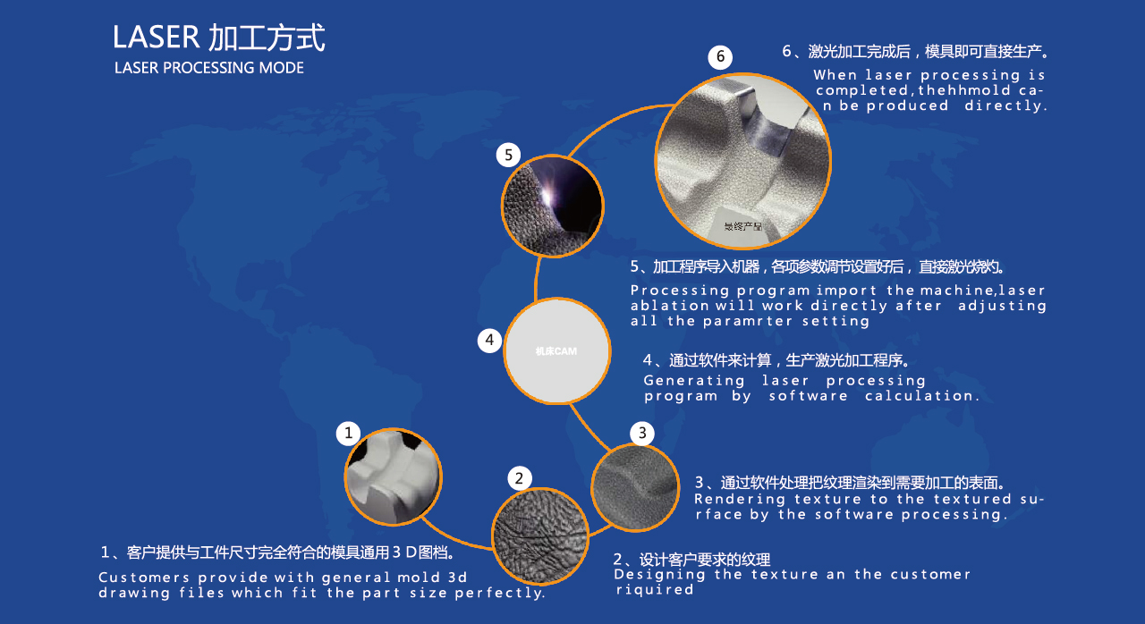 3D激光雕刻技术的超越性 三维激光雕刻是现代化的产物,最高性能全数字化技术,可以将思想转化为创新实物,甚至是人的指纹,并超越传统纹理图案方面的限制,做到更精准,更细腻,更高端。 当今产品外观纹理无个性化,同质化非常严重。 以前产品外观纹理是手工蚀刻与CNC刀具加工,而手工蚀刻与CNC刀具加工都是有局限性,达不到精细与逼真的自然效果。而产品革命性的的来临,利用数字化纹理设计(使用图片)和五轴激光设备激光加工的完美结合,使一切变得可能; 利用数字化,实现电脑设计生成程序,使任何图形纹理逼真度得以保证;再导入激光设备加工(最细达到20μm),利用激光进行超精细加工,让一切变得可以实现, 让我们客户产品外观与众不同,让我们客户对产品外观的无穷想象力转化成真。 3D激光雕刻的加工方式 3D激光雕刻=全球数字化+全方位加工 在实际加工之前,通过模拟计算可检查可加工区域的准确性和可行性。