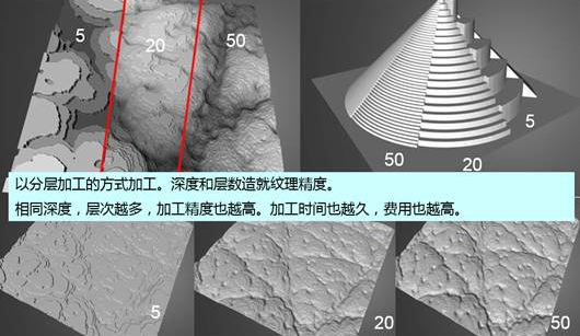 3D激光的加工原理:以分层加工的方式加工, 深度和层数造就纹理精度;相同深度,层次越多,加工精度也越高; 加工时间也越久,费用也越高。